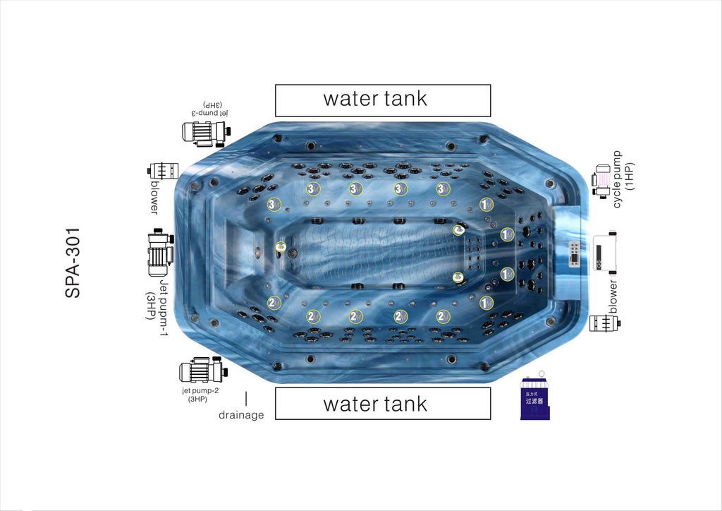 Garantin gäller ej vid frysskador och omfattar inte heller ozonator, nackkuddar, spalock, filter, belysning och ev musikanläggning.